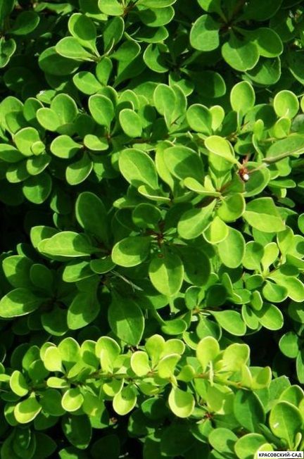 Листва — главная особенность сорта. Листья мелкие, глянцевые, насыщенного зеленого цвета. Цветение происходит в мае, цветки мелкие, желтые. Плоды — красные ягоды, украшающие куст осенью.