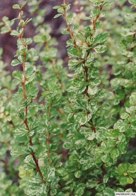 Листва — главная особенность сорта. Листья зеленые с кремово-желтыми и розовыми пятнами, создающими неповторимый узор. Цветение происходит в мае, цветки мелкие, желтые. Плоды красные, долго сохраняются на кусте.