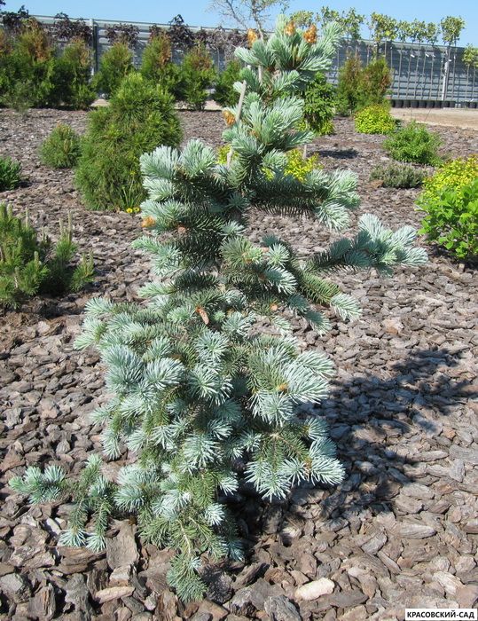 Дерево с широко-конусовидной, густой, плотной кроной. К 20 - и годам высота 5 м. В 40 лет высота 8 - 10 м, диаметр кроны 5 - 6 м. Растет достаточно медленно. Годовой прирост в высоту 30 - 35 см, в ширину 15 см. Хвоя колючая, толстая, серебристо-голубая с сизым налетом. Не меняет цвет зимой. Сорт выведен в 1970 г. в Германии. Местоположение: Солнце. Почва: плодородная, увлажненная, дренированная, суглинистая.