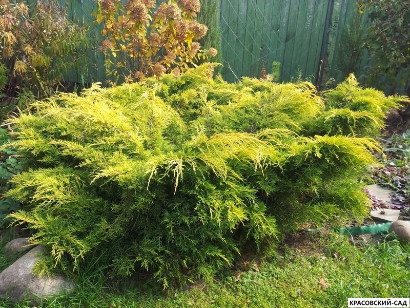 Компактная форма и насыщенный золотистый окрас делают его идеальным выбором для создания живых изгородей, альпинариев и групповых посадок. Высота до 1,5 м, ширина до 2 м. Хвоя золотисто-желтая, особенно яркая весной и осенью. Растет медленно, около 10 см в год. Предпочитает солнечные места и хорошо дренированные почвы.