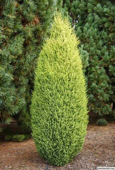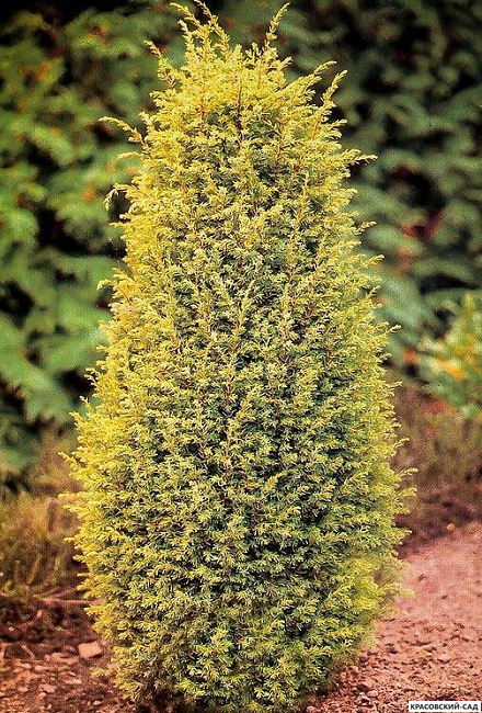 Растение отличается яркой золотистой окраской хвои и строгой колоновидной формой.